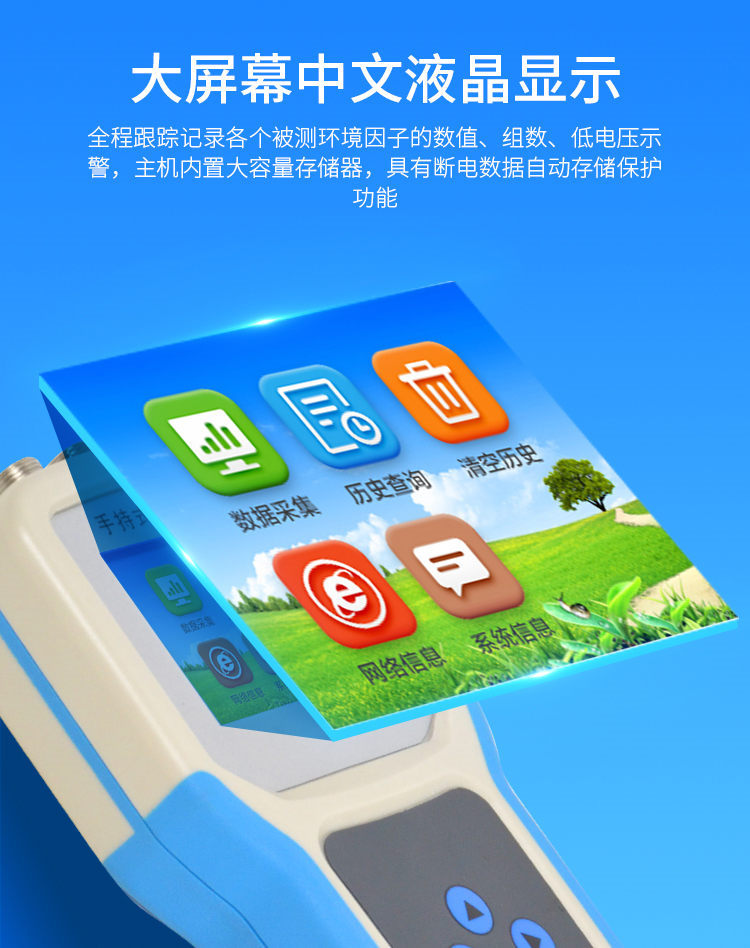 大屏幕中文液晶顯示,全程跟蹤記錄各個被測環(huán)境因子的數(shù)值、組數(shù)、低電壓示警,主機內(nèi)置大容量存儲器,可儲存三十萬條數(shù)據(jù),具有斷電數(shù)據(jù)自動存儲保護功能。