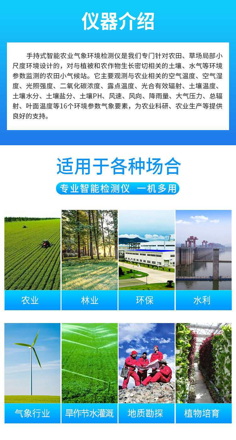 廣泛應(yīng)用于農(nóng)業(yè)、林業(yè)、環(huán)保、水利、氣象行業(yè)、旱作節(jié)水灌溉、地質(zhì)勘探、植物培育等領(lǐng)域。