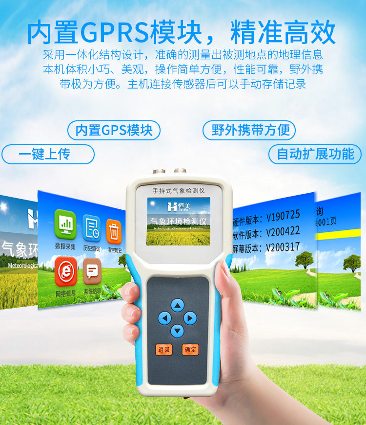 采用一體化結(jié)構(gòu)設(shè)計,內(nèi)置GPS模塊,GPRS模塊,外置SD卡,能準確的測量出被測地點的地理信息,界面除顯示所測環(huán)境參數(shù)、存儲數(shù)據(jù)外,還可顯示測點的經(jīng)緯度。通過內(nèi)置的GPRS一鍵上傳被測點的環(huán)境因子測量數(shù)據(jù)等。同時還可以通過外置SD卡直接把數(shù)據(jù)導(dǎo)出到電腦上。(可選)