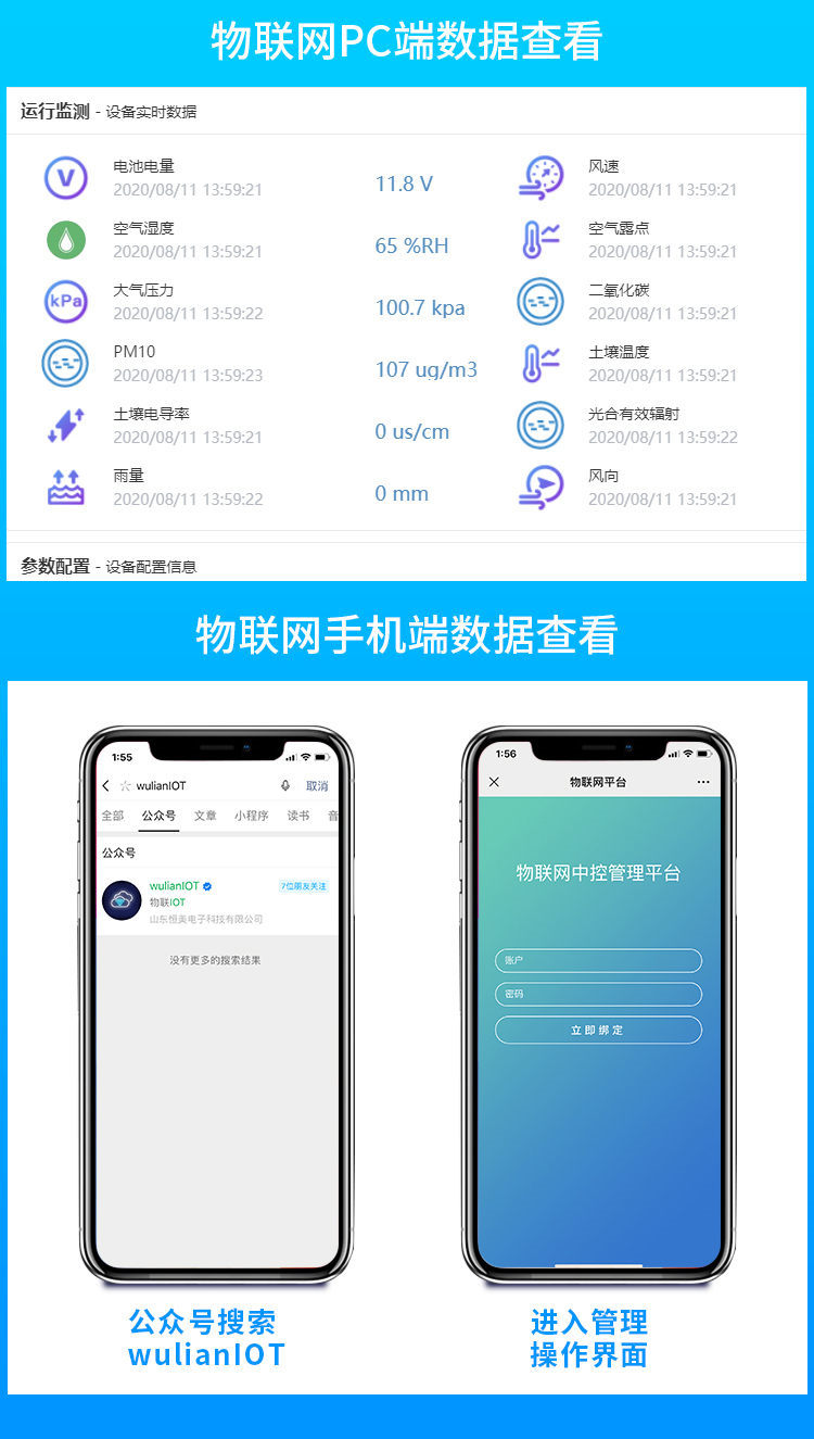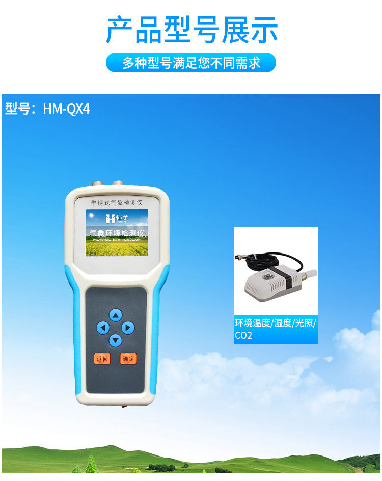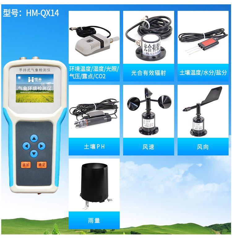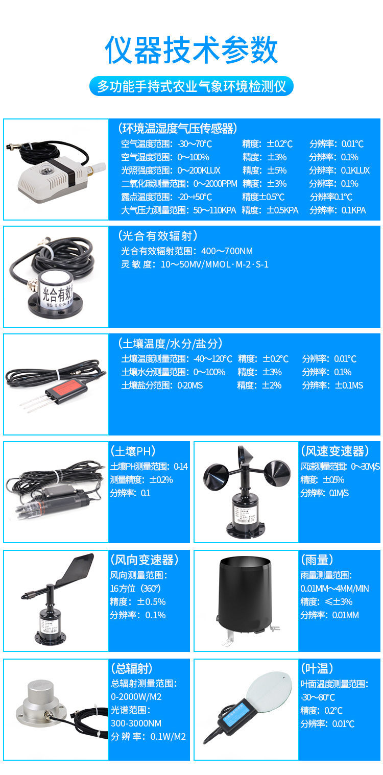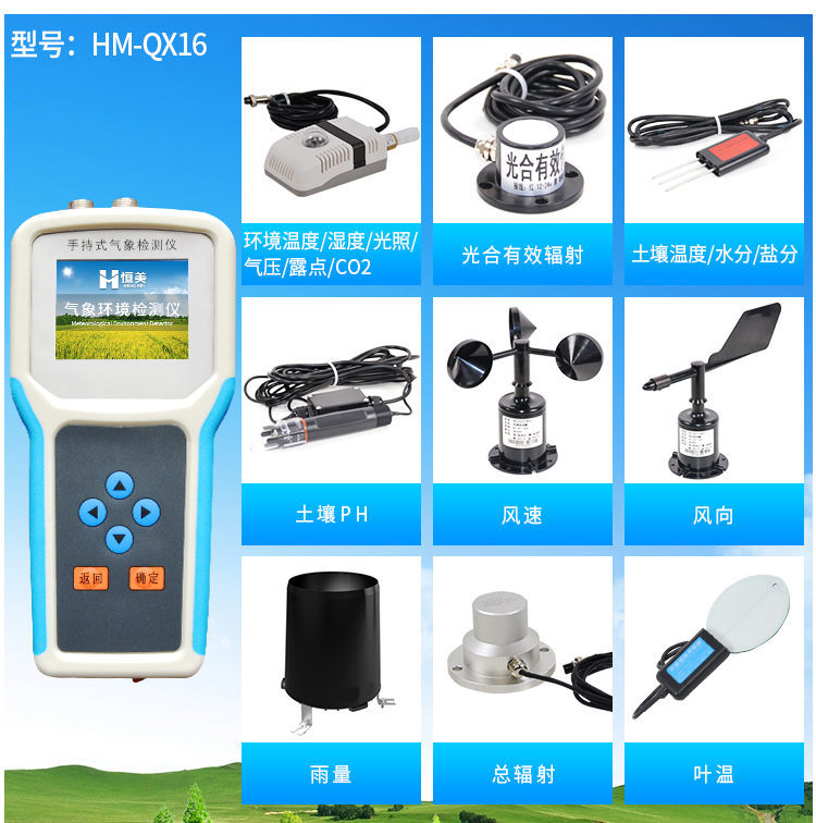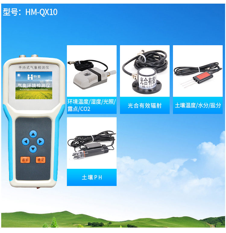 【產(chǎn)品簡介】觀測空氣溫濕度、光照強度、CO2、露點、光合有效輻射、土壤溫濕度、土壤鹽分、土壤PH、風(fēng)速風(fēng)向、降雨量、大氣壓力、總輻射、葉面溫度等16個氣象要素...
